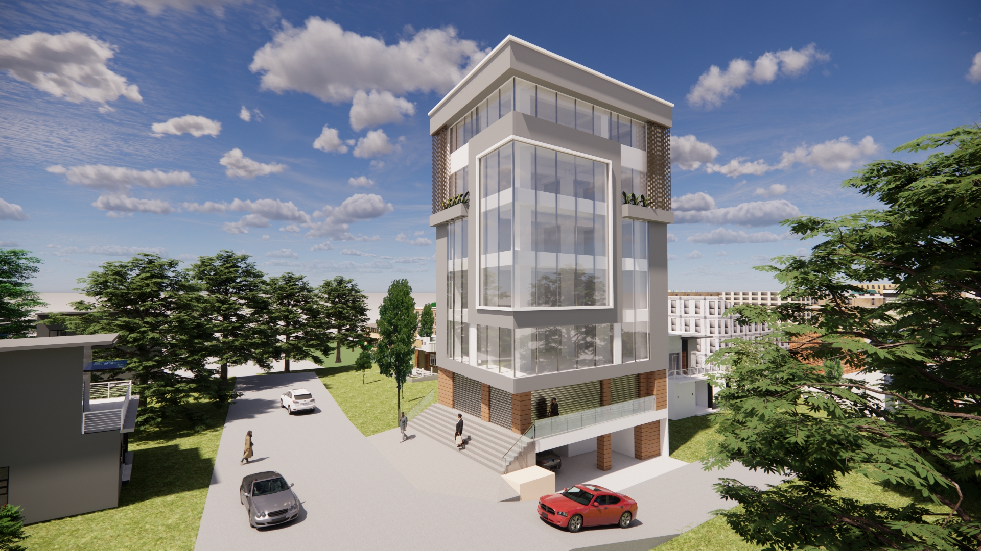 A thoughtfully designed mixed-use building in the heart of Chandol, offering a total built-up area of 8,826.47 sq. ft. The project includes a basement, six upper floors, and a top floor, combining commercial spaces with private residential areas. Large glazed facades, clean lines, and contemporary detailing create a striking presence in the urban landscape.